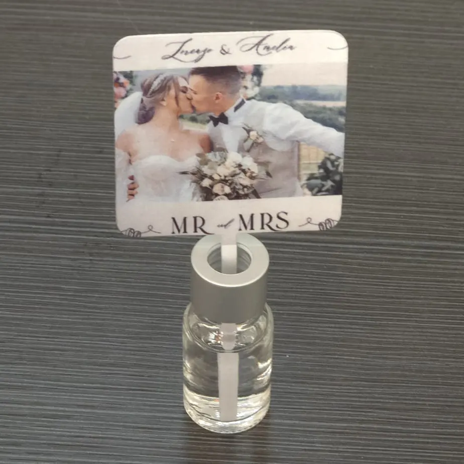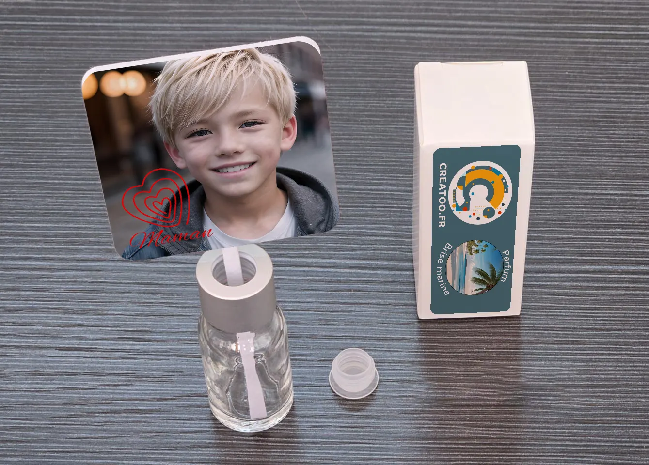 Composé d’un contenant en verre de 10ml renfermant votre parfum préféré, il est accompagné d’un élément en feutrine conçu pour diffuser délicatement l’arôme dans l’air ambiant. La véritable innovation réside dans la personnalisation de la partie haute de l’élément en feutrine, un carré de 6×6 cm que vous pouvez personnaliser sur les deux faces avec une photo, un texte, un logo ou toute autre illustration de votre choix.