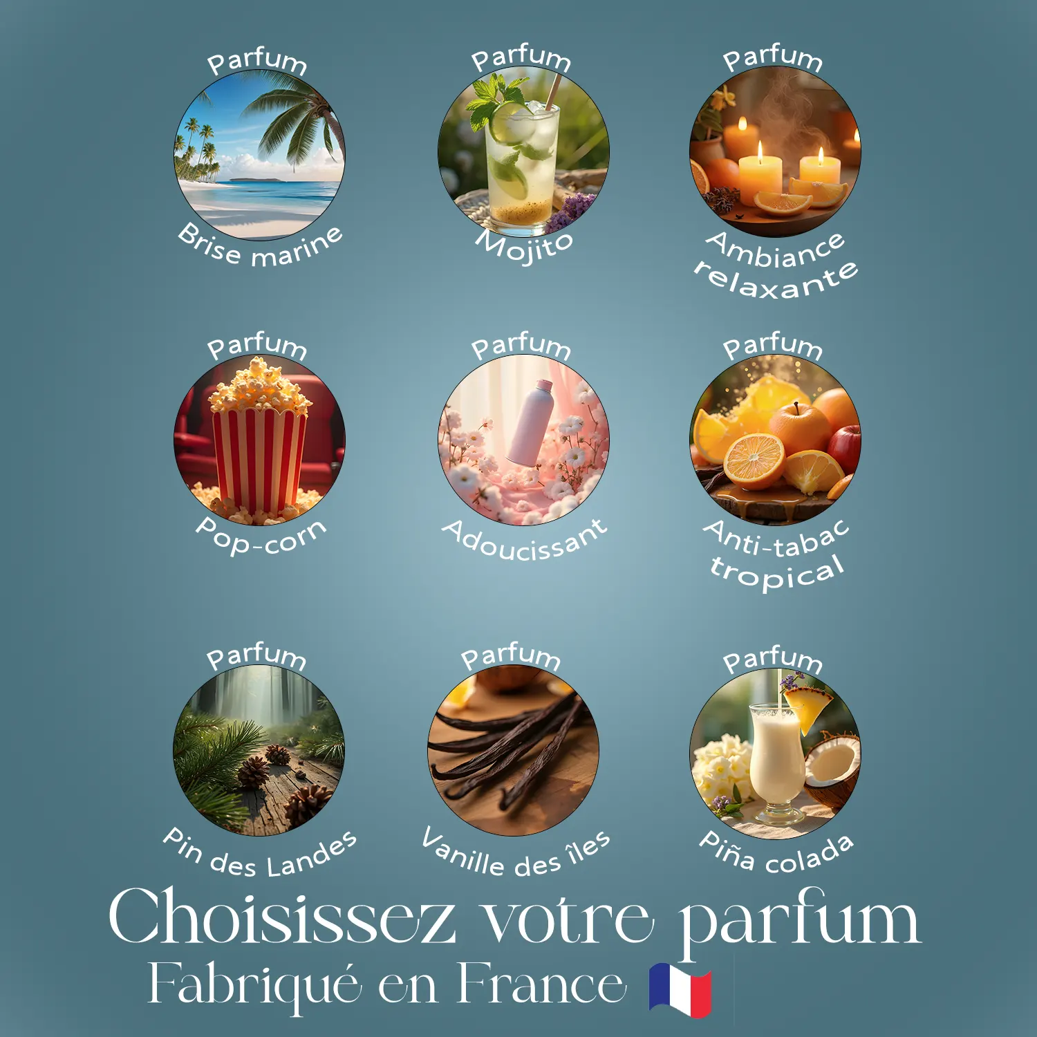 | Senteur | Sans parfum, Adoucissant, Ambiance relaxante, Anti-tabac tropical, Mojito, Pin des Landes, Piña Colada, Pop-corn, Vanille des Îles |